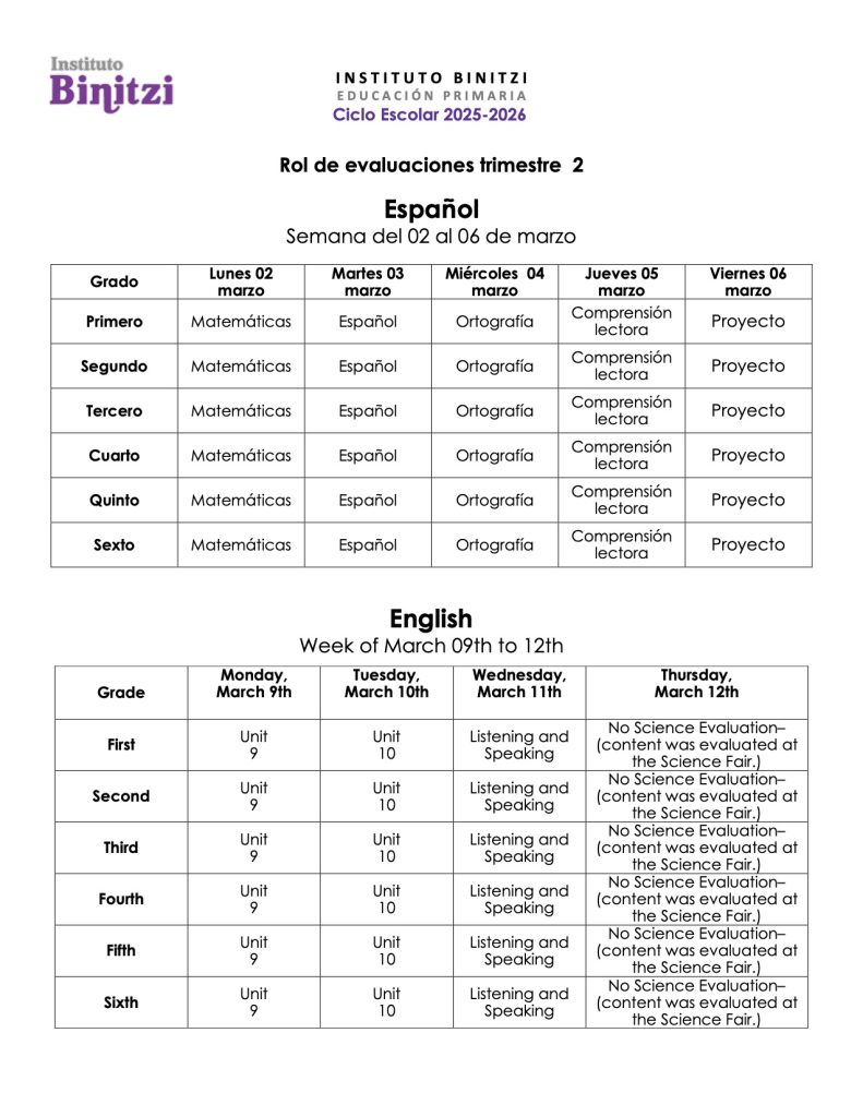 Del lunes 2  al miércoles 12 de marzo, se realizarán las evaluaciones del 2do  trimestre de Español e Inglés.